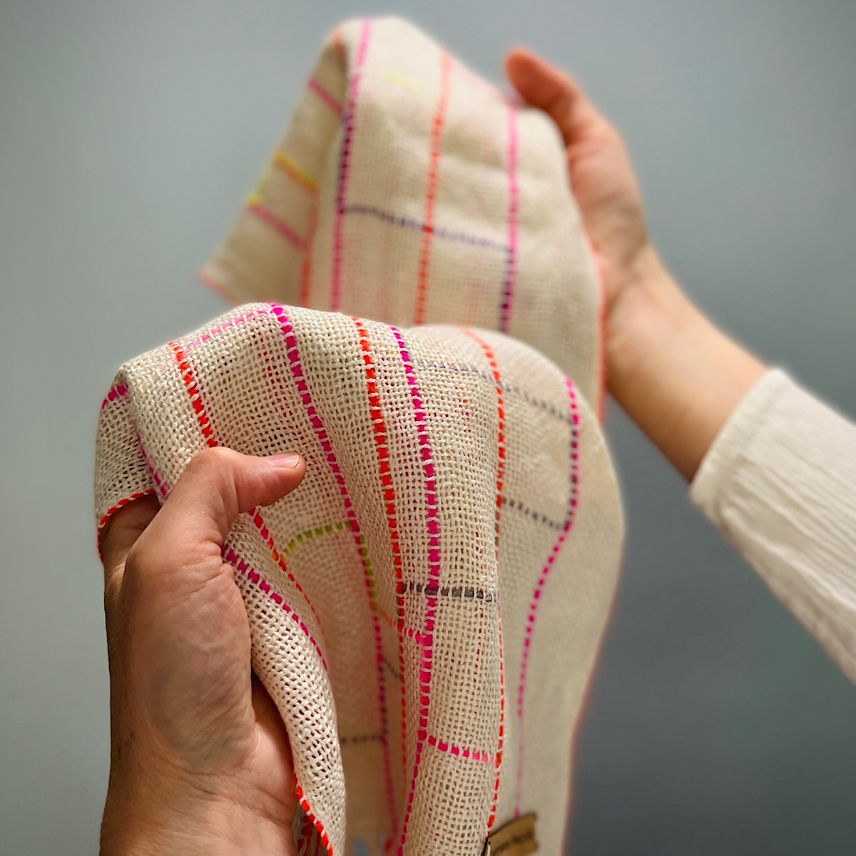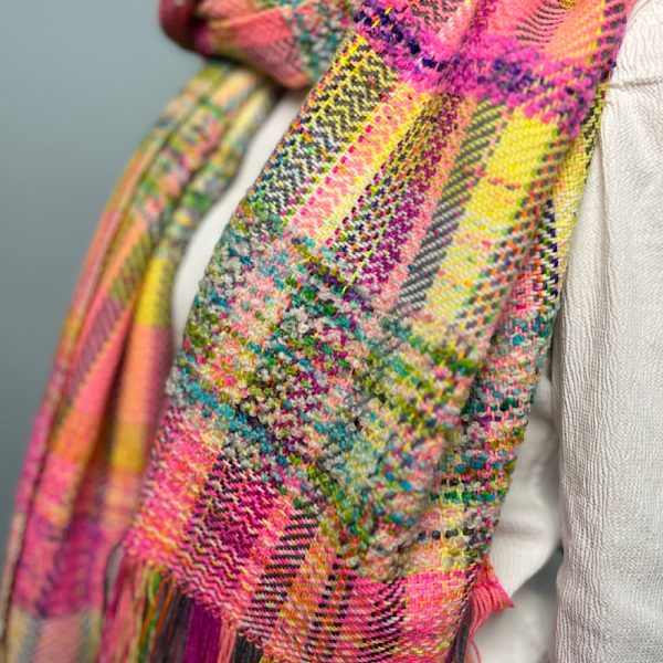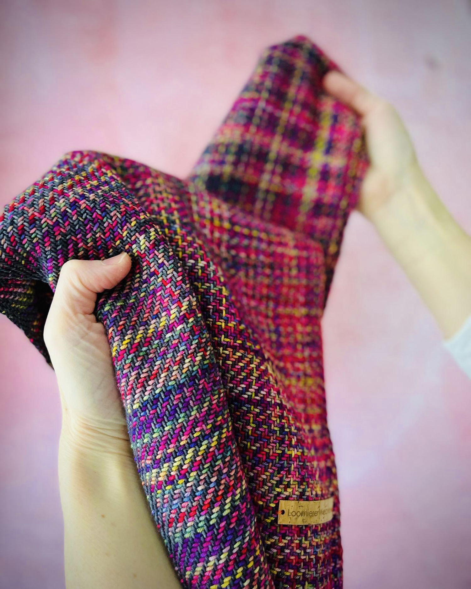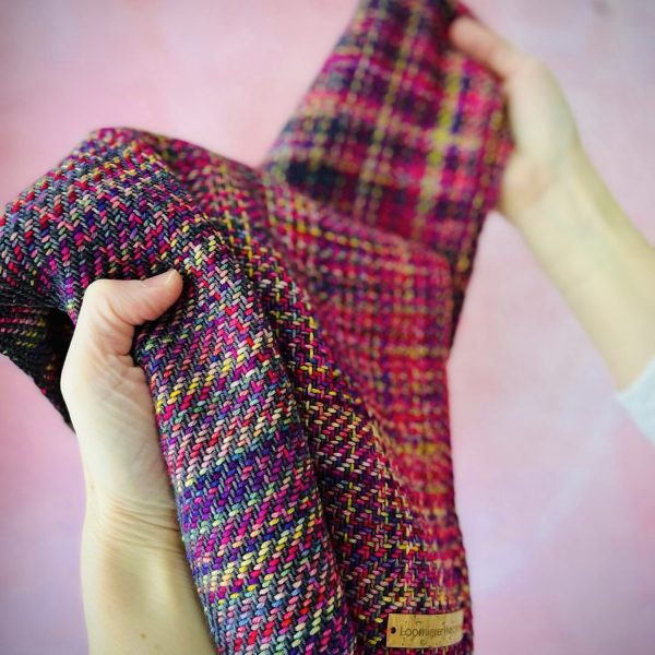 I create one-off handwoven scarves in vibrant, stunning colour combinations designed in modern patterns using 4-shaft looms.