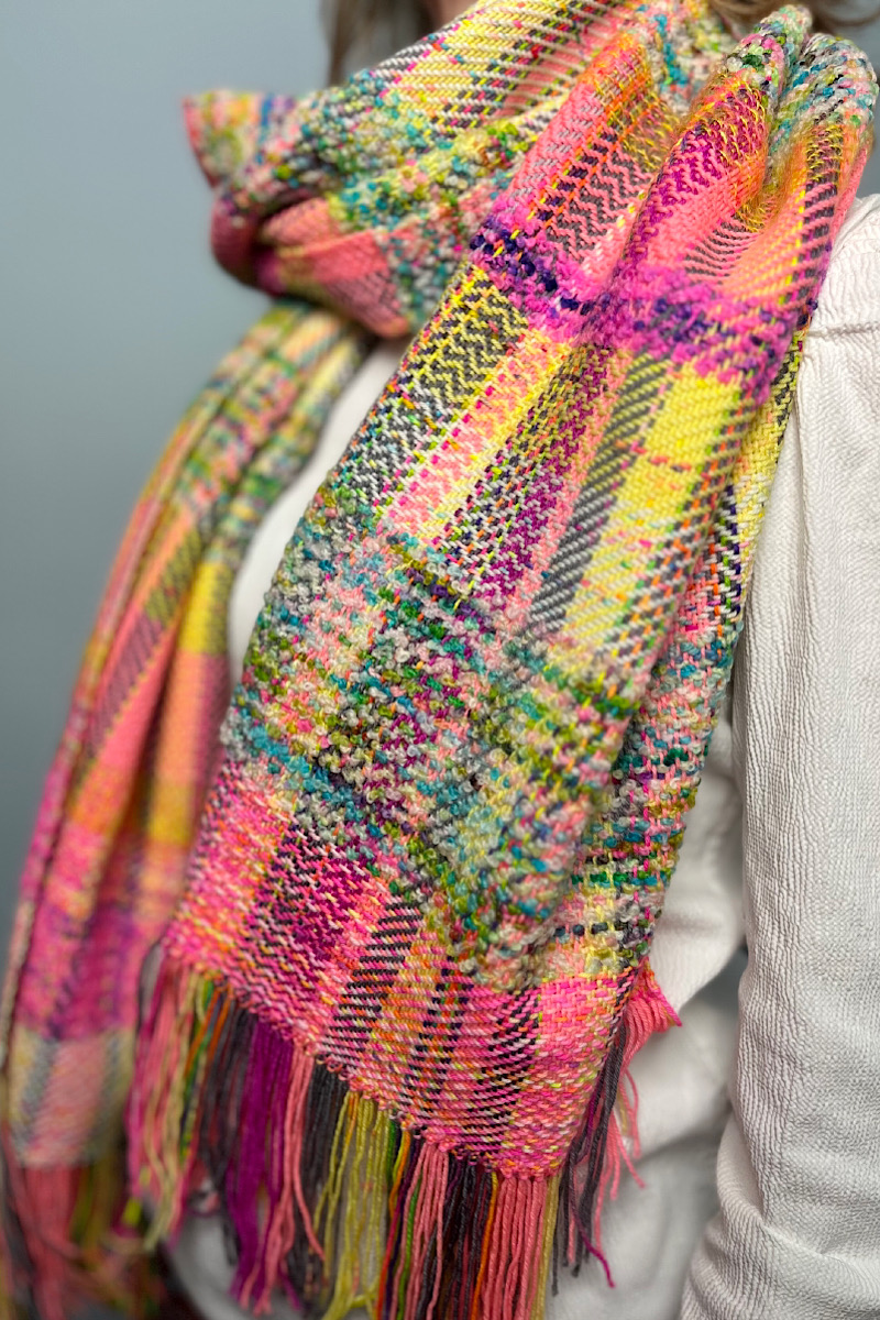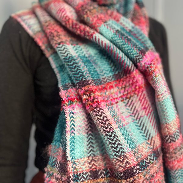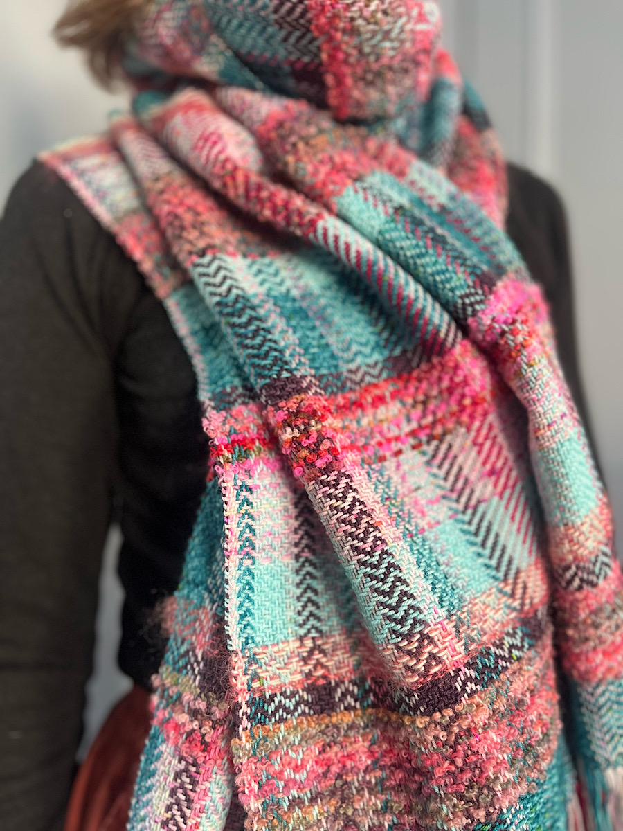 Large Naomi Scarf handwoven in teals and pinks, merino, merino boucle and silk mohair.