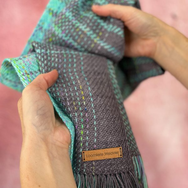 Graduated scarf handwoven in Turquoise and grey merino wool.